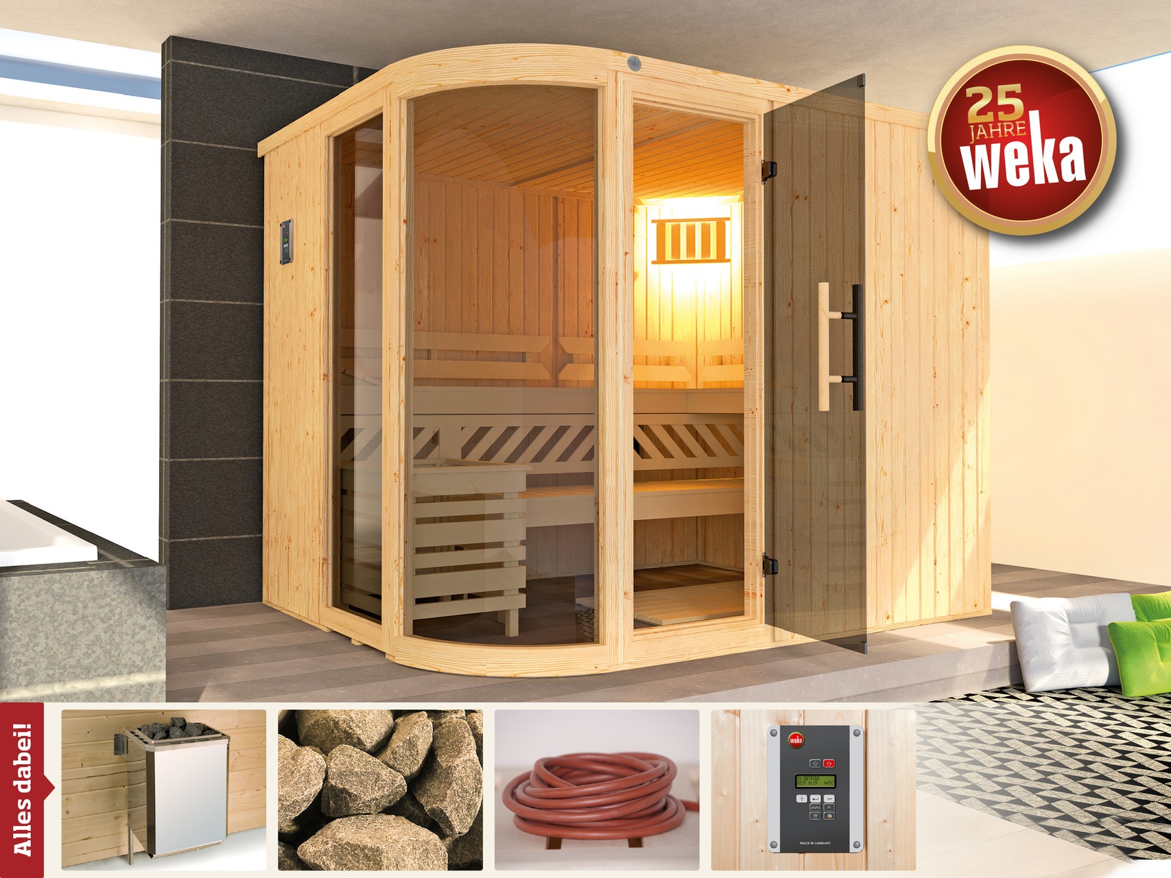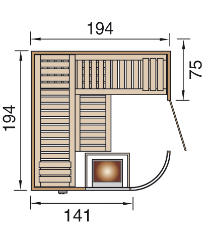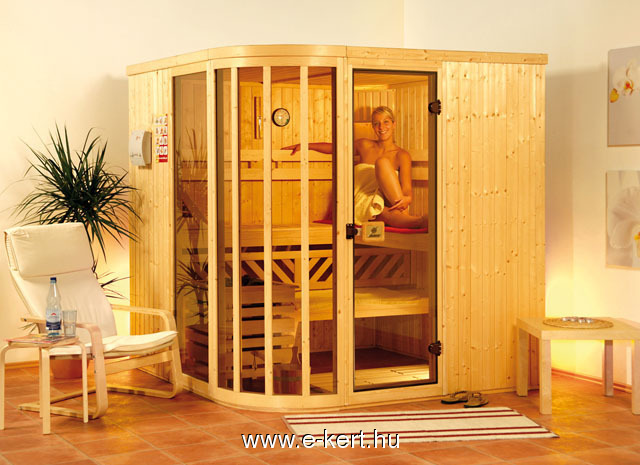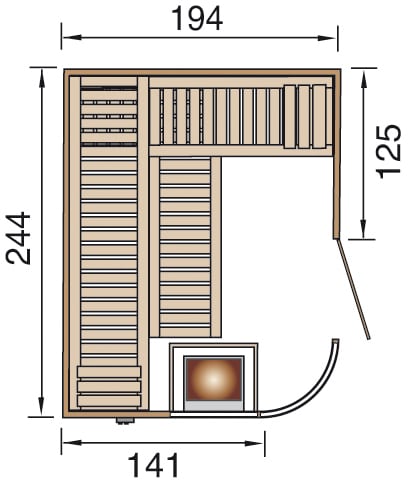 Finn szauna íves ablakelemmel 244 x 194 cm vagy 194×194 cm szaunakályhával és digitális vezérlővel.