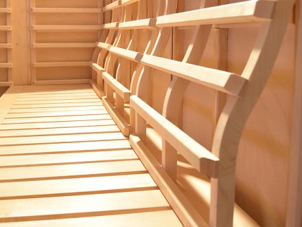 • Belső berendezés, ülőpad, (ca. 45 cm mély) és háttámla speciális fából: sima, finom optika kis hővezető képességgel