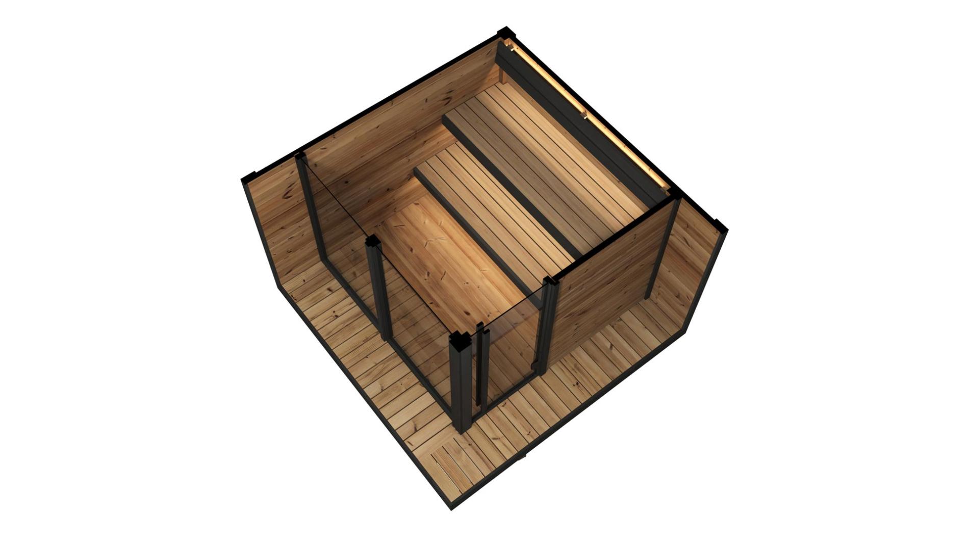 - Weka Viira 2-es szauna méret még több üveg felülettel. Kész szaunaház külső mérete 229 x 229 cm (szauna kabin 185,7*177,2 cm)