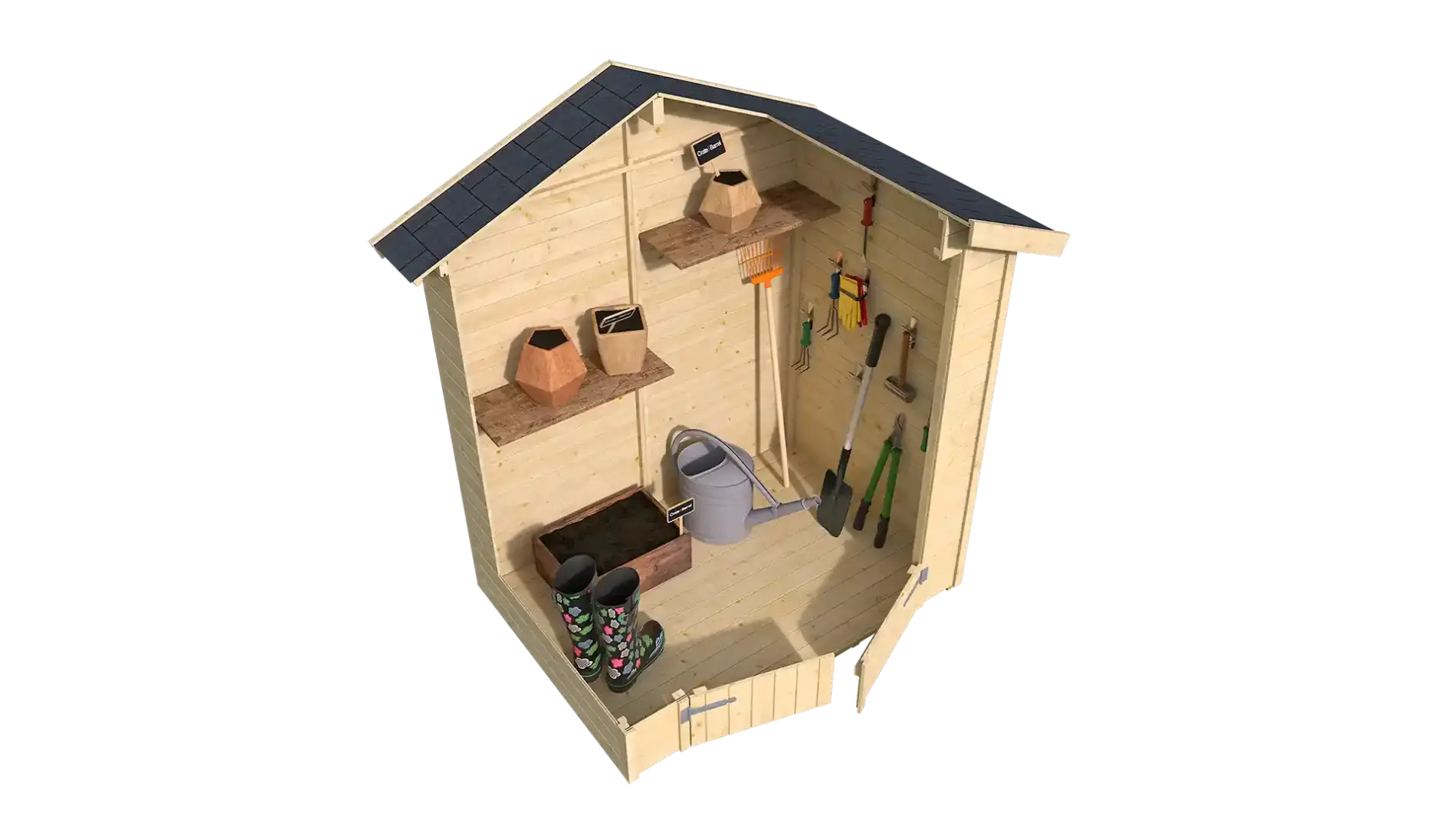 - Szerszámtároló faház falvastagsága: 13 mm; a tetőlambéria 15,5 mm vastag