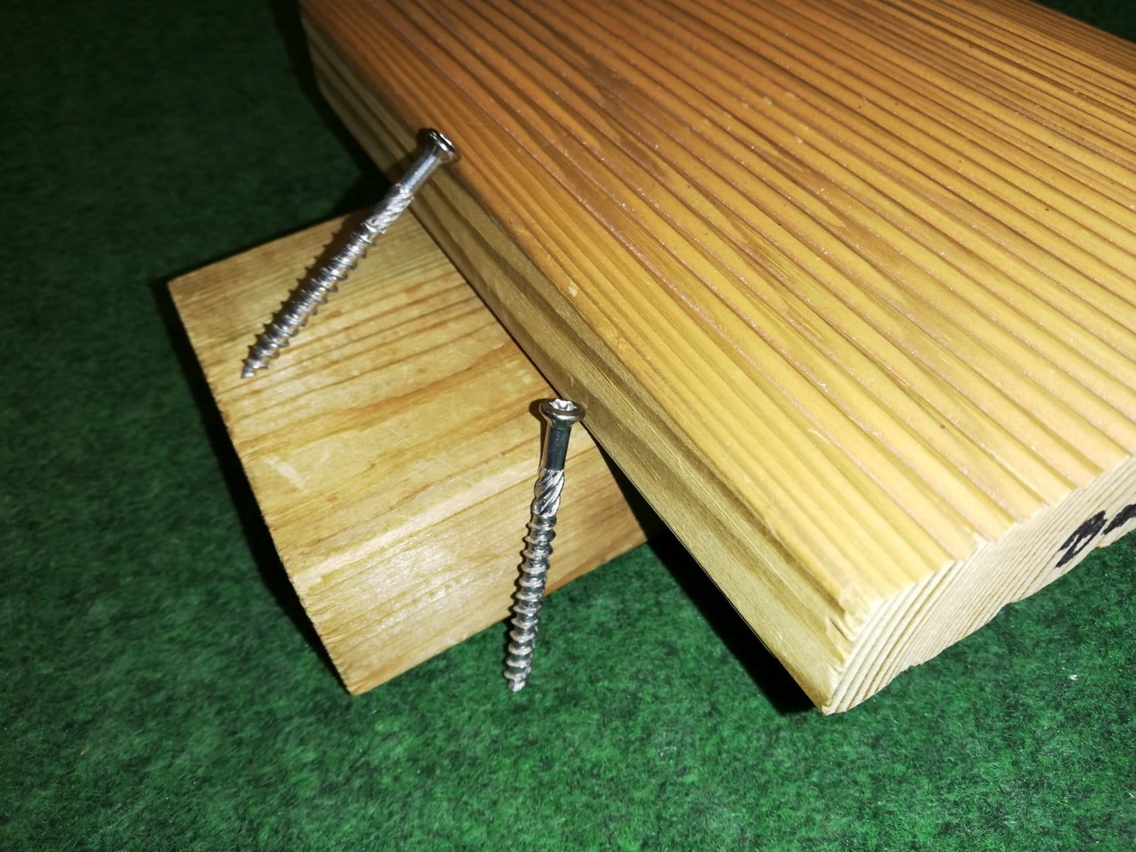 Kültéren a teraszcsavarok ki vannak téve az időjárás viszontagságainak. Talán nem szorul magyarázatra, ha azt mondjuk, csak anyagában rozsdamentes, A2 minőségű csavart használjon! A horganybevonatos csavarok behajtáskor sérülhetnek, és ezen sérülések helyén egy-két év alatt megjelennek a rozsdafoltok. A rozsda pedig nem méltó egy minőségi fából készült teraszhoz. Ajánlott kültéri padló csavarunk rozsdamentes, edzett, martenzites acélból készült, amelyet a fejrész alatt megerősítettek, és a menetet ellátták egy a behajtást könnyítő bevonattal.