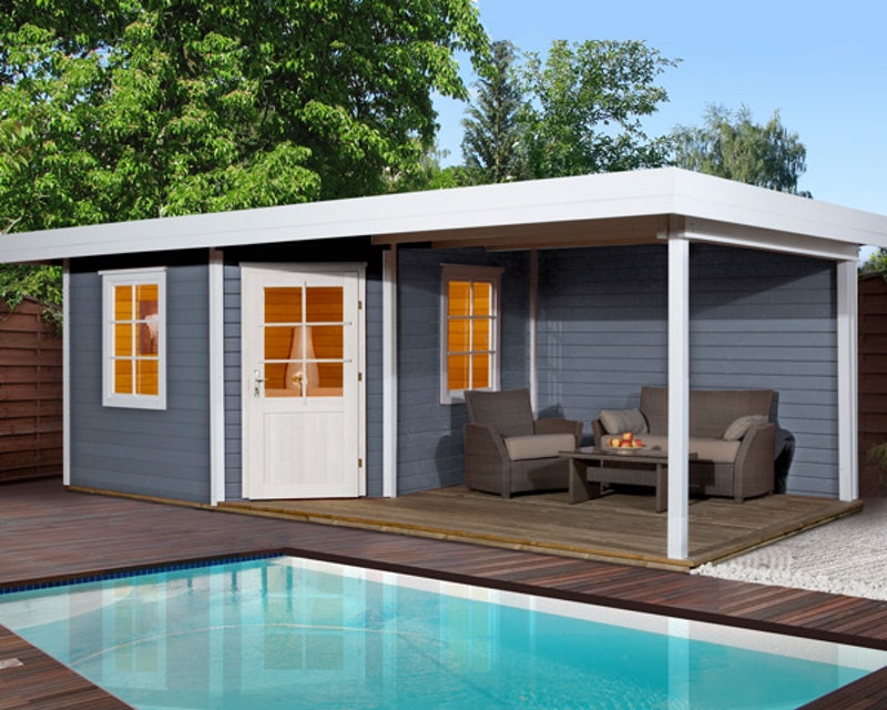 Prémium Weka Fides 213-as design faház 303 cm-es terasztetővel, választható méretben és színben. Kerti pihenő faházak gyártása forgalmazása.